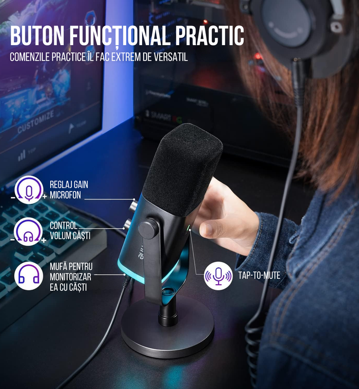 Răspuns: Da, microfonul include controale intuitive, precum un buton de mute, un reglaj de gain pentru ajustarea volumului de intrare și un jack pentru căști care permite monitorizarea sunetului în timp real — astfel poți personaliza cu ușurință experiența audio.